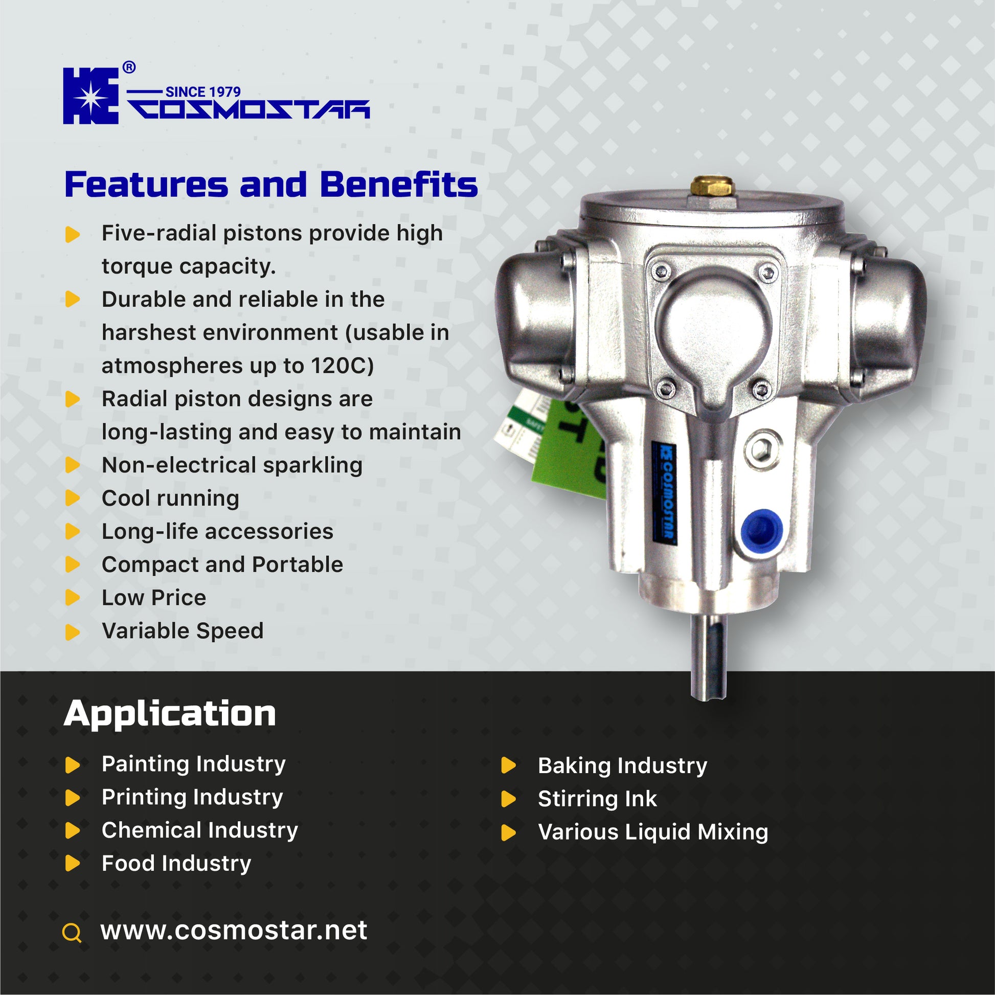 COSMOSTAR AM0707 air motor can be mounted in almost every position you wish and still delivers smooth work with slight vibration. Thus it offers a wide variety of mounting options. They are designed to meet the challenges of today’s paintings and coatings.