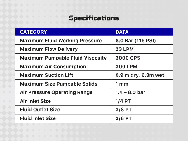 Experience unparalleled efficiency with the D0902 3/8" Double Diaphragm Pumps, expertly crafted to offer a smooth, reliable flow at low air pressure. Ideal for diverse fluid transfer needs, this pump is a perfect fit for both industrial and commercial applications.