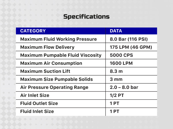 Robust Technical Specifications: With a maximum fluid working pressure of 8.0 bar and the ability to handle fluid viscosities up to 5000 CPS, this pump is built to last. It also features a maximum suction lift of 8.3 meters and can handle solids up to 3 mm in size.
