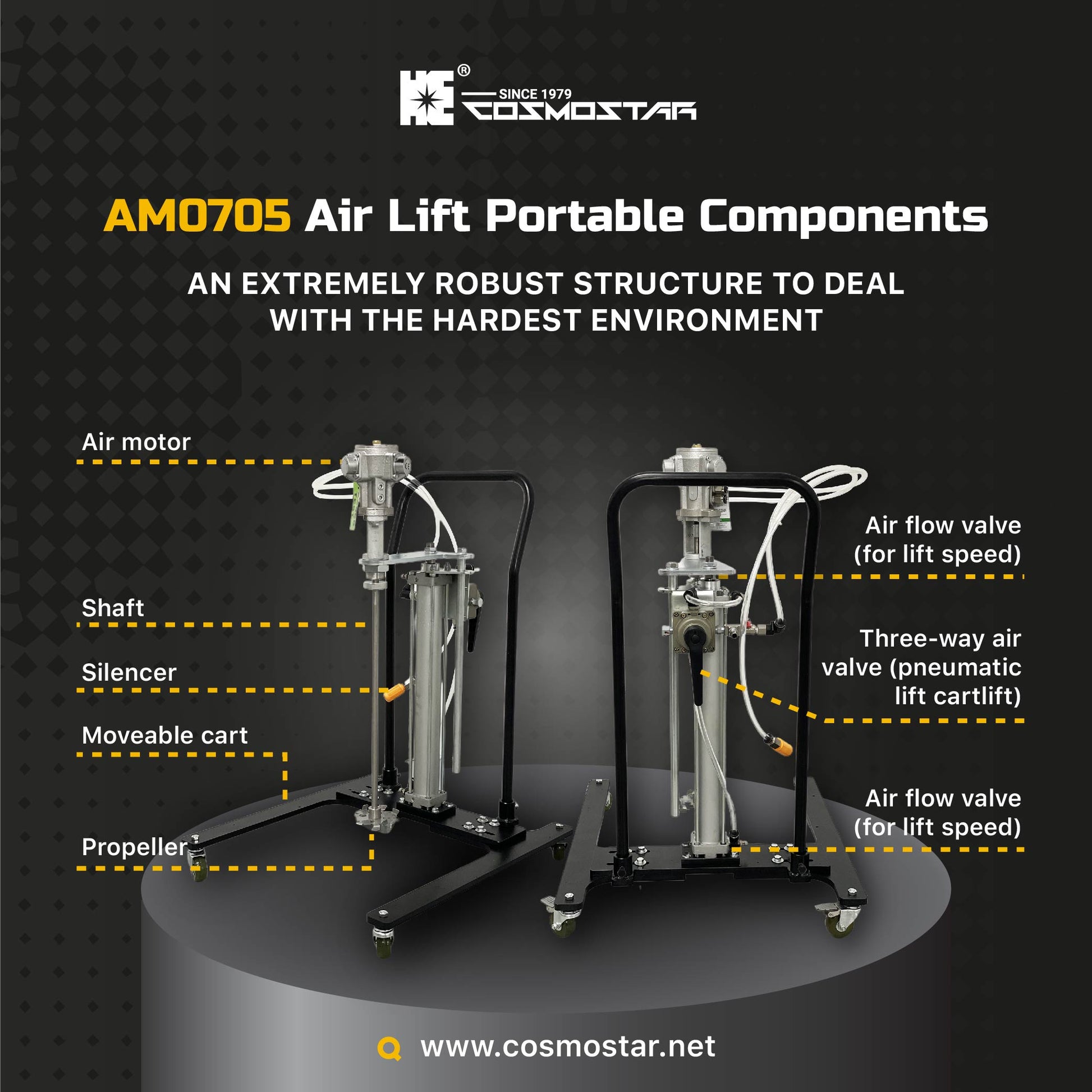 [Specification] AM0705 1/8HP air motor, 5-gallon pneumatic lift cart, 304 stainless steel shaft, 1 pcs G10 gear blade and stainless shaft connector.