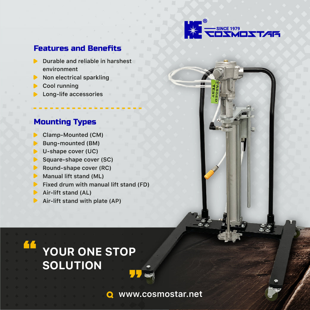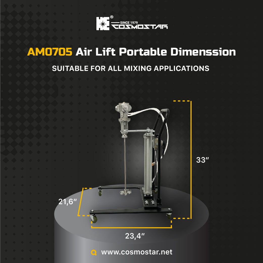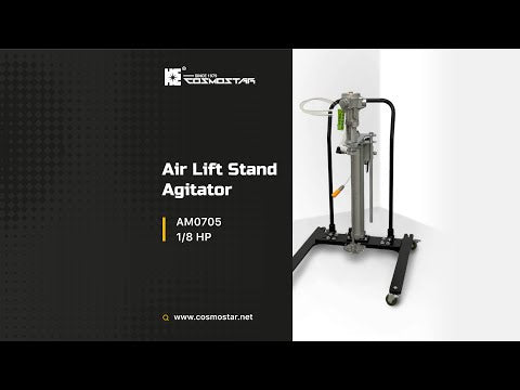 COSMOSTAR M0705 5 Gallon Automatic Air Lifting Pneumatic Agitator mixer is suitable for the most commonly used 5 gallons. The agitator can be raised directly by turning the air switch valve with the pneumatic lifting trolley. It is convenient to put the raw material bucket under the agitator, then put down the agitator, and carry out the mixing action of raw materials.
