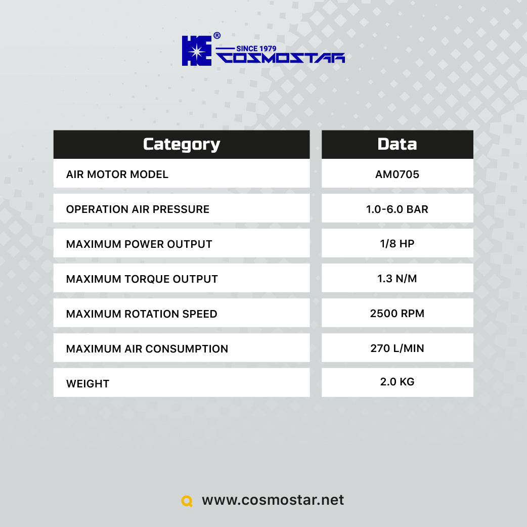[Air Motor] AM0705 Air motor provides a high torque capacity of Max 1.3 N/m and a max rotation speed of 2500 RPM, suitable for the panting industry, printing industry, chemical industry, food industry, baking industry, stirring ink, and various liquid mixing.