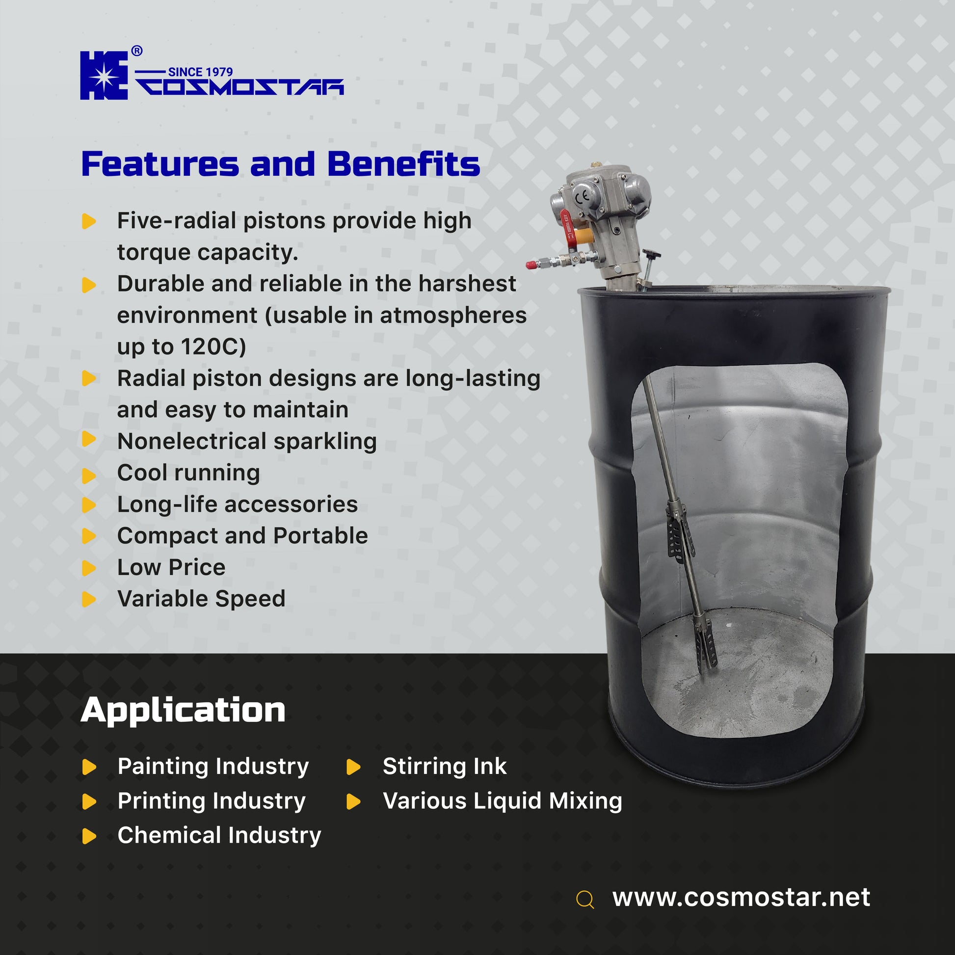 Durability That Lasts: Constructed with longevity in mind, the COSMOSTAR features a durable air motor that stands up to the rigors of continuous use in harsh environments. Complemented by high-quality accessories, this agitator is built to provide reliable service while requiring minimal maintenance.