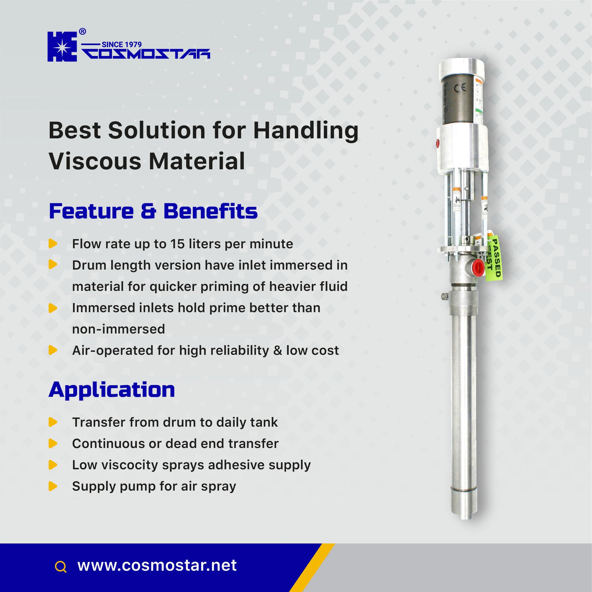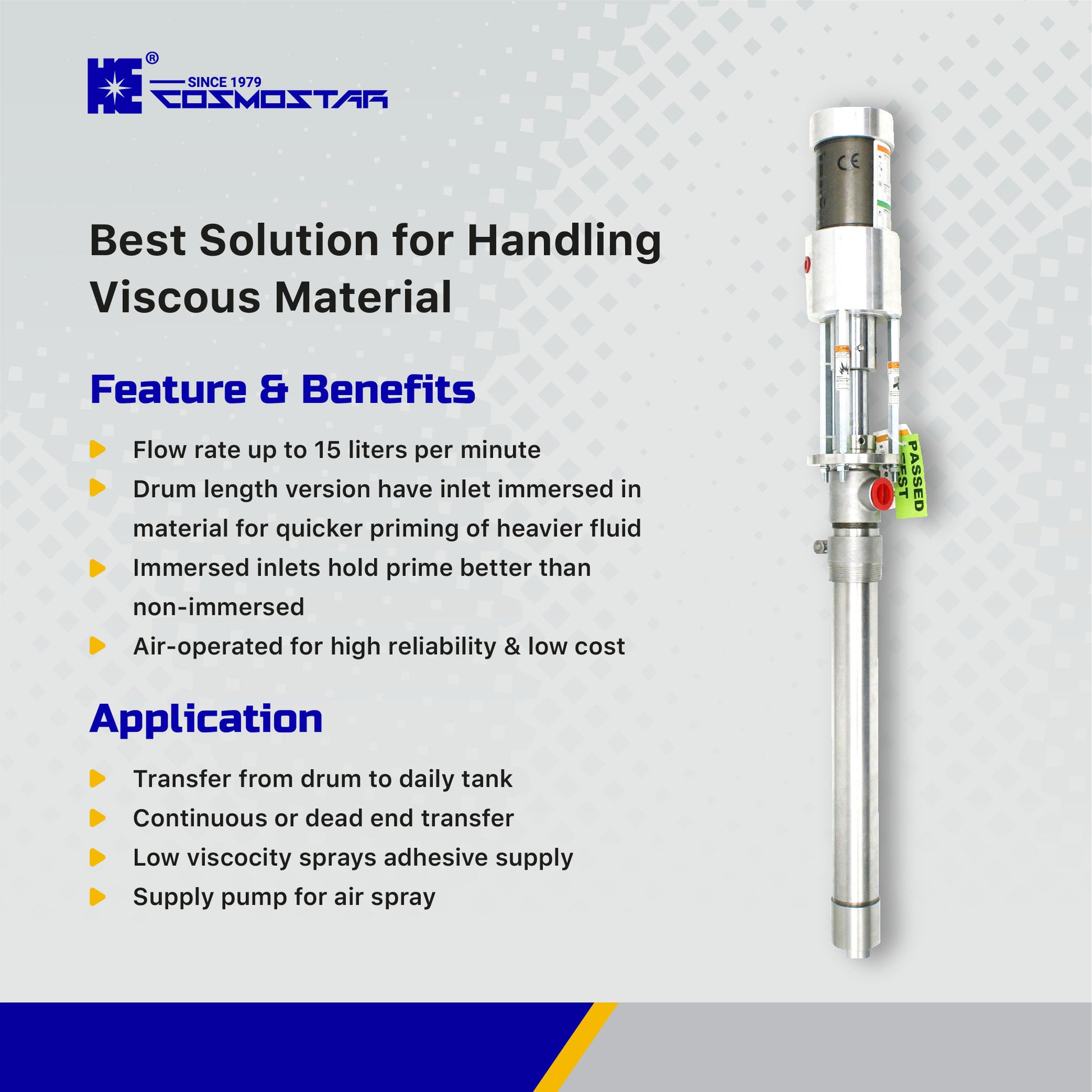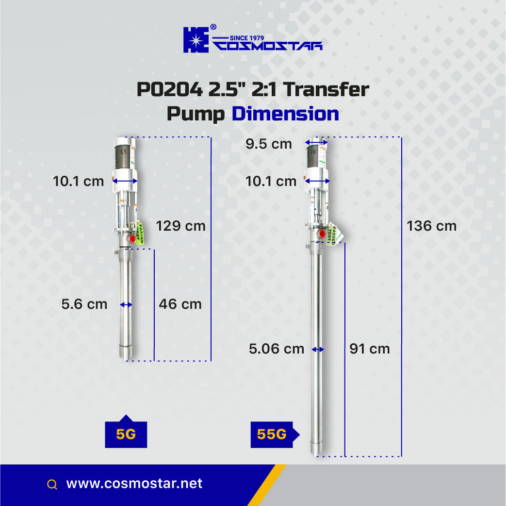 The COSMOSTAR P0204 2.5" 2:1 Transfer Pumps are robust, high-performing solutions engineered for efficient fluid transfer. Equipped with 2.5-inch HI FLUX air motors, these pumps boast a high flow rate of up to 15.0 liters per minute, making them ideal for handling low-viscosity materials that necessitate quick transfers. The P0204 series has compact bodies for easy plugging and direct use on drums or containers, offering durability and endurance even in the harshest environments.