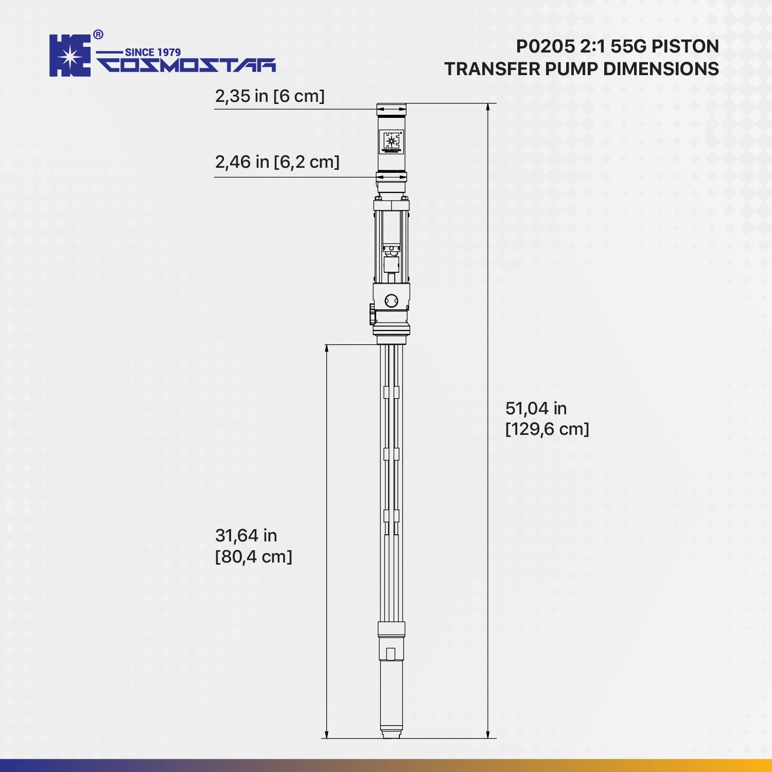The Cosmostar P0205 2:1 Air Operated Pneumatic Piston Pump is engineered for reliable and economical fluid transfer in industrial and workshop environments. Its 2:1 pressure ratio delivers smooth, controlled flow—ideal for oils, solvents, chemicals, and light coatings.