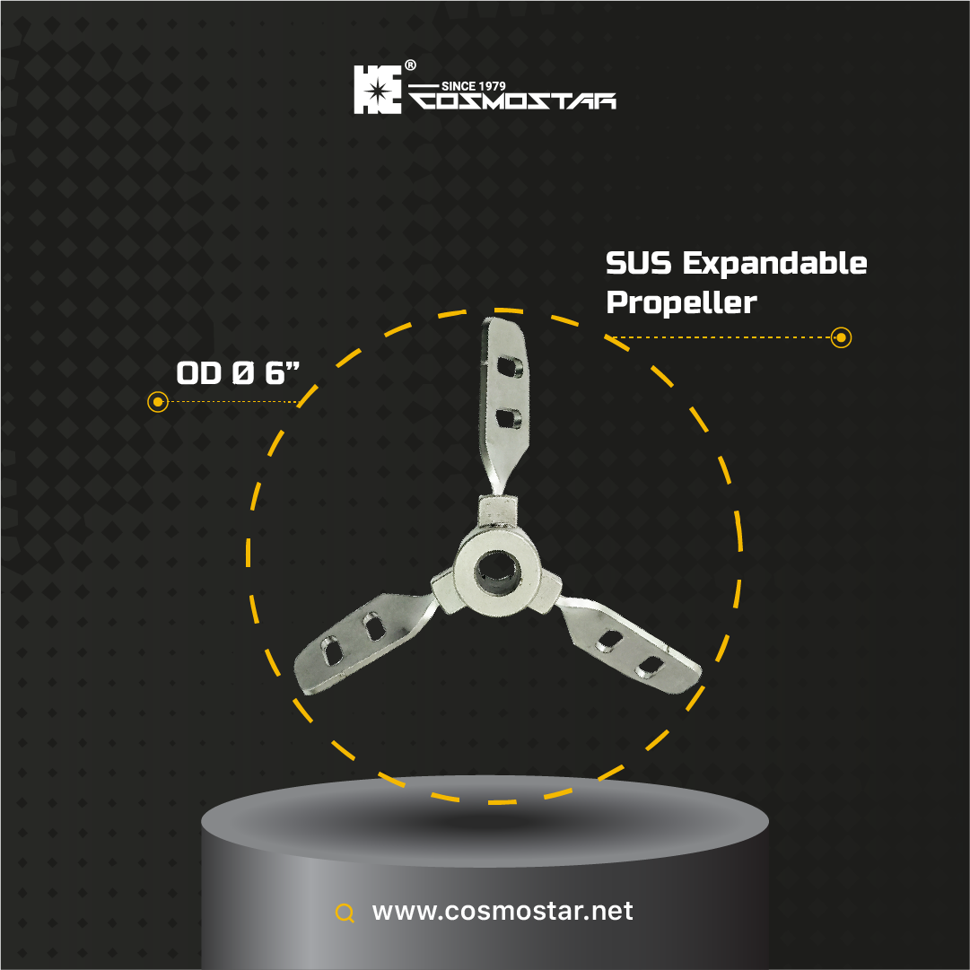 5. EXPANDABLE PROPELLER - The expandable 6" SUS propeller can fit into 200-liter drum with 2" bung, fully opens when the agitator starts rotating for optimal efficiency
